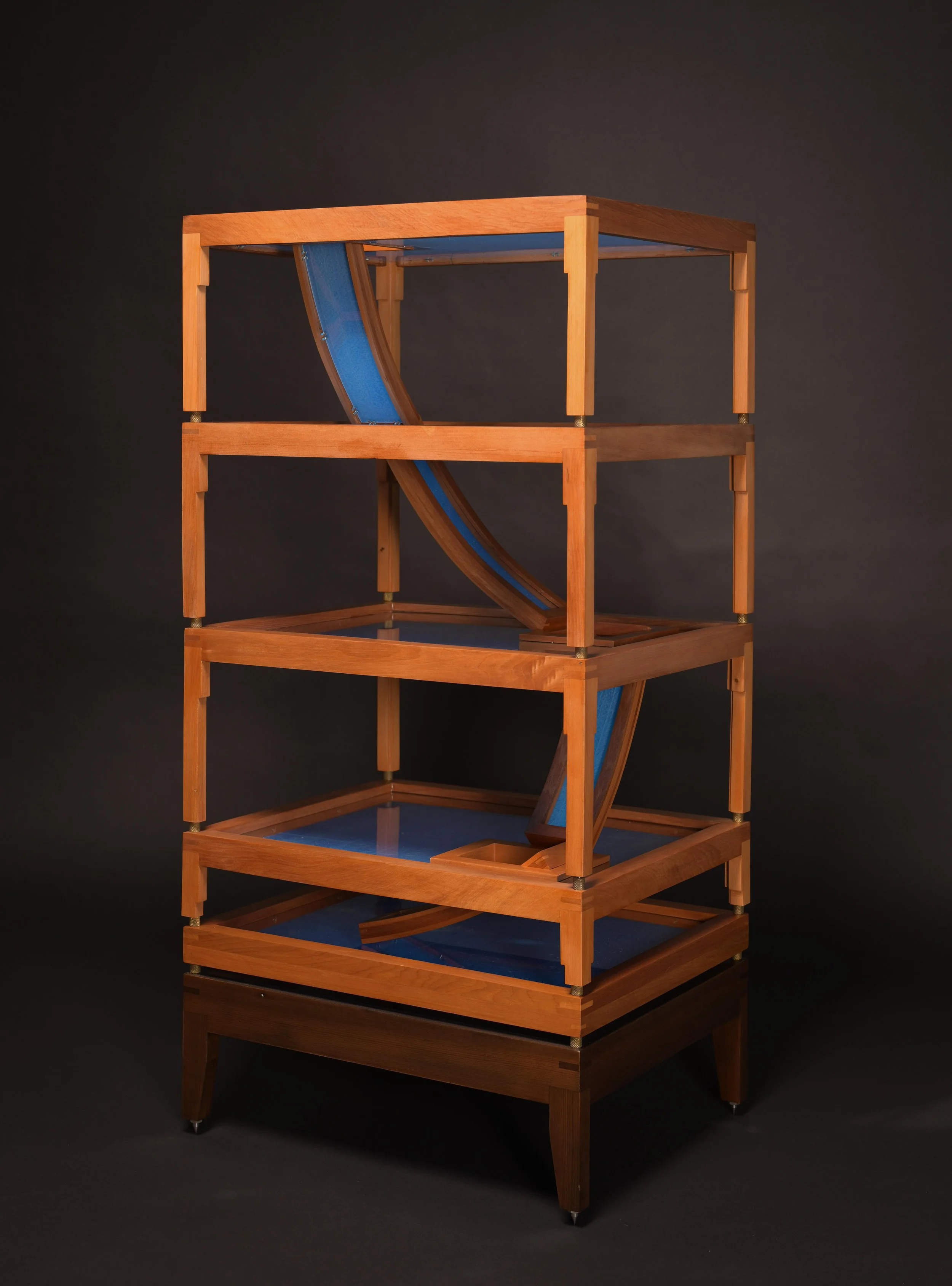 890 x 540 x 435 (1100h with stand) Matai (recycled from old window frames), used tarpaulin (from my fathers shed), bent acrylic, French polished, brass fittings.